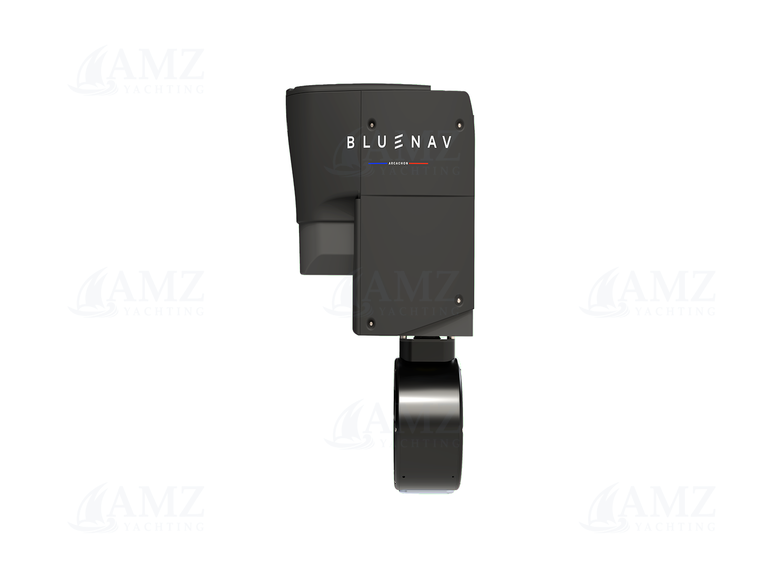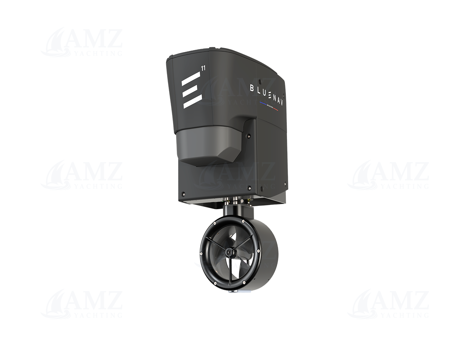 The BlueSpin system is an electrical propulsion system designed to be used as a secondary motor to hybridize a boat's pre-existing thermic propulsion.